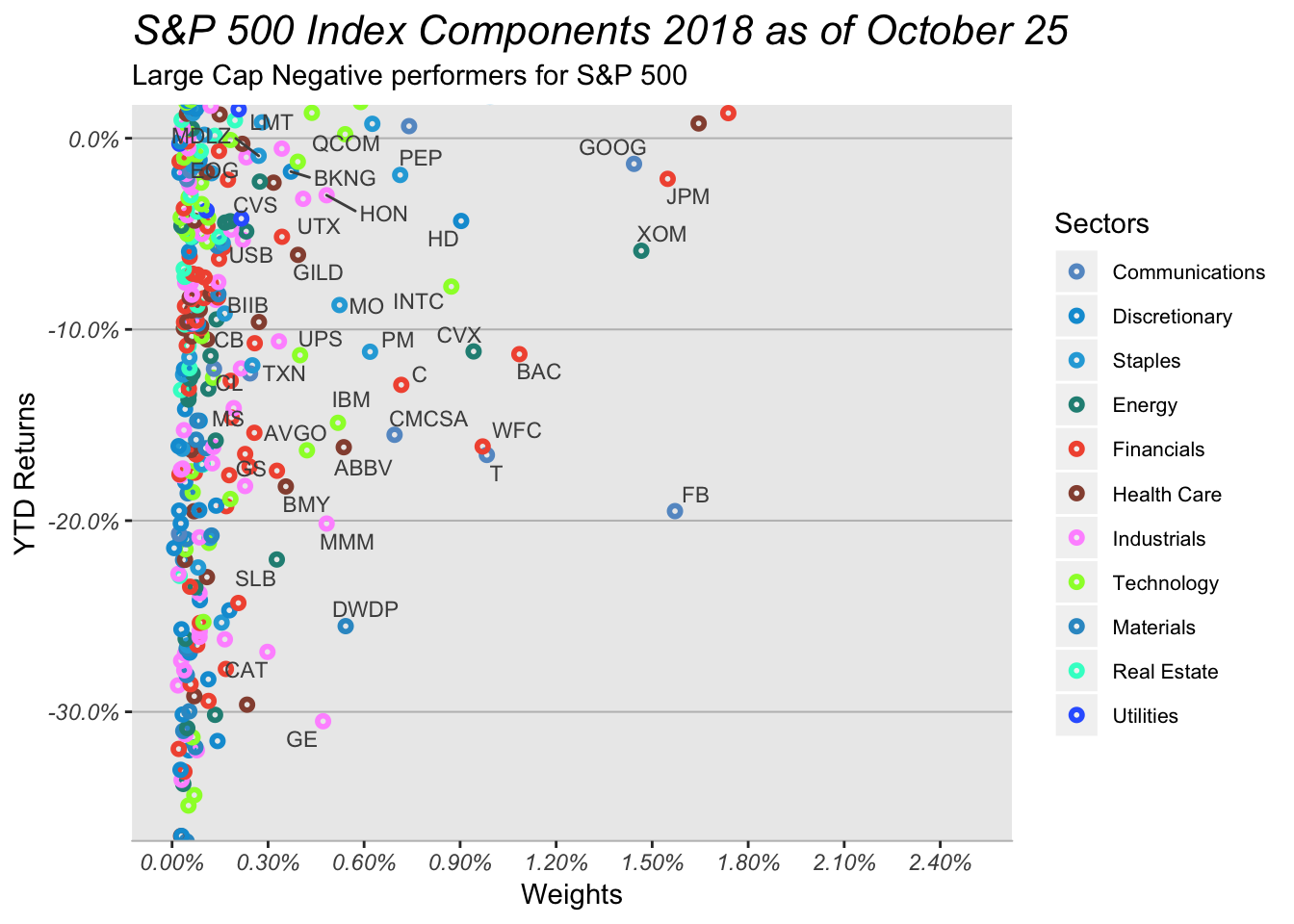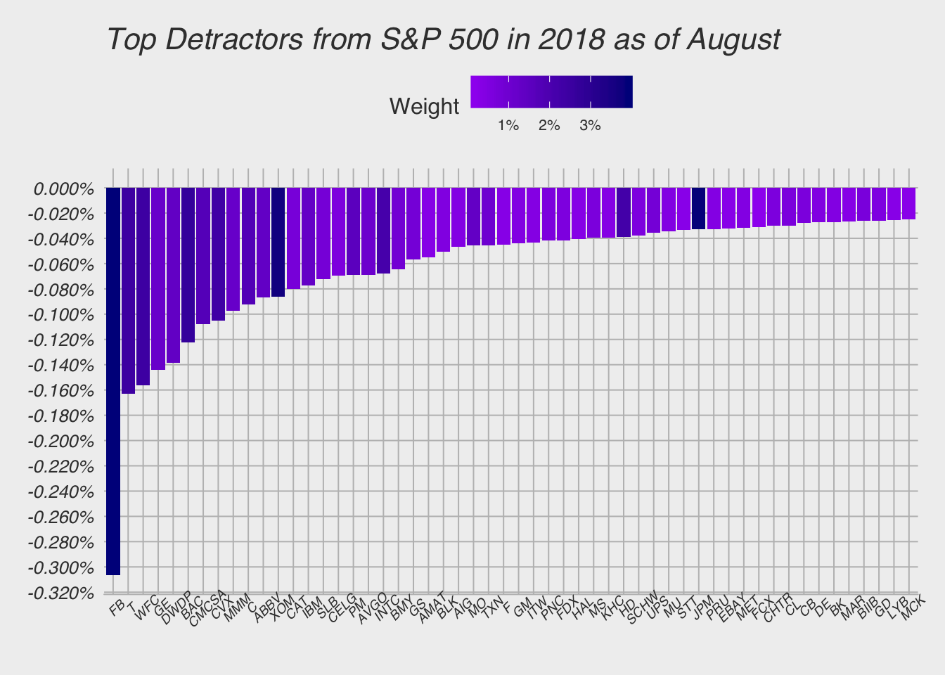 Here we can see that Facebook is the largest detractor this year, but there are also names such as AT&T, Wells Fargo, Dow Dupont, Exxon Mobile and GE with negative contributions.