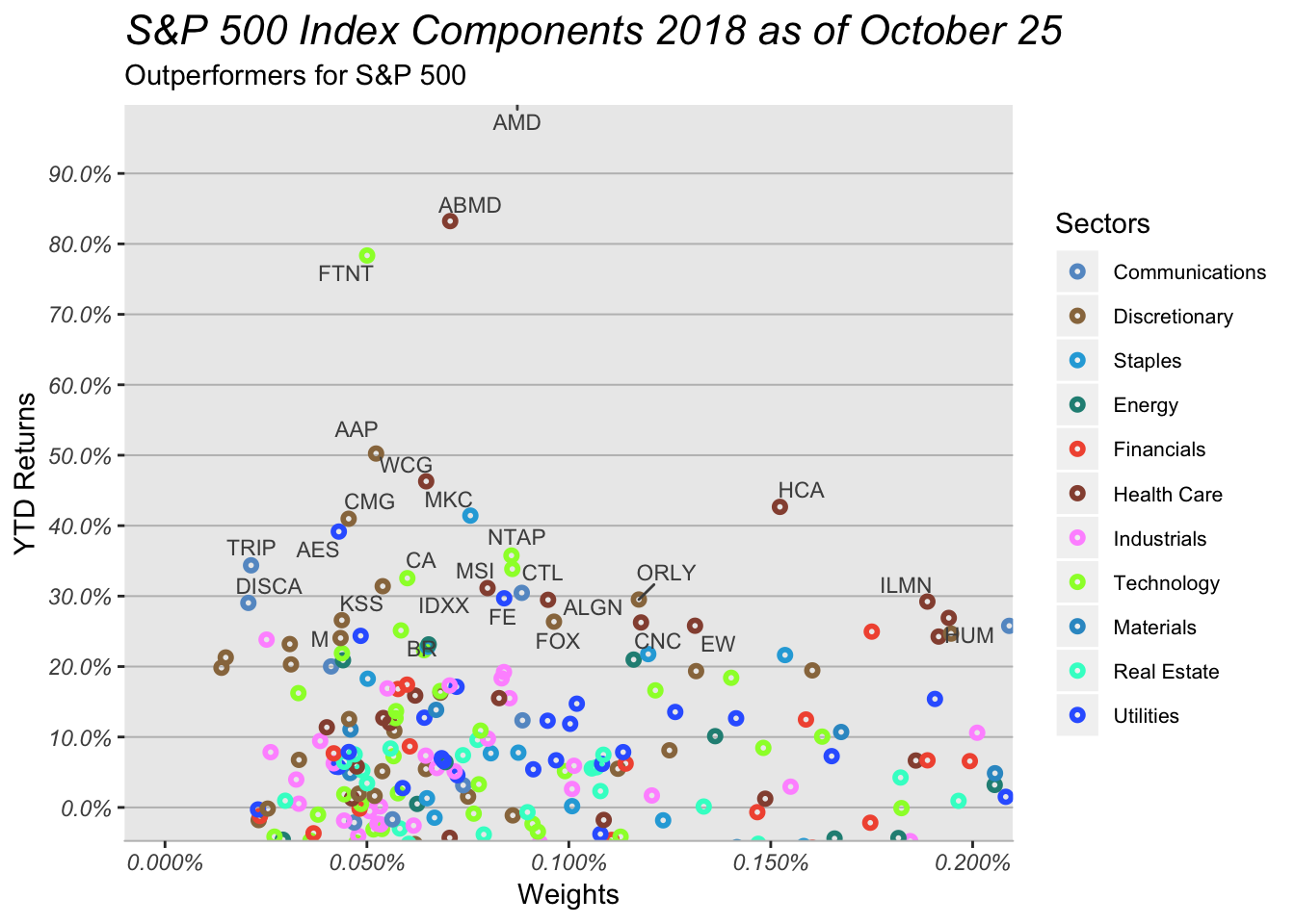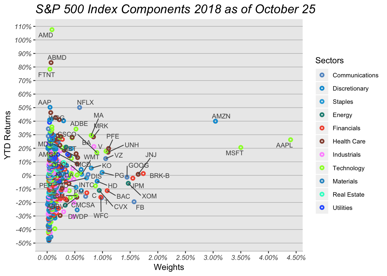 Next we can take a look under the hood and see how different S&P 500 components have been performing this year.