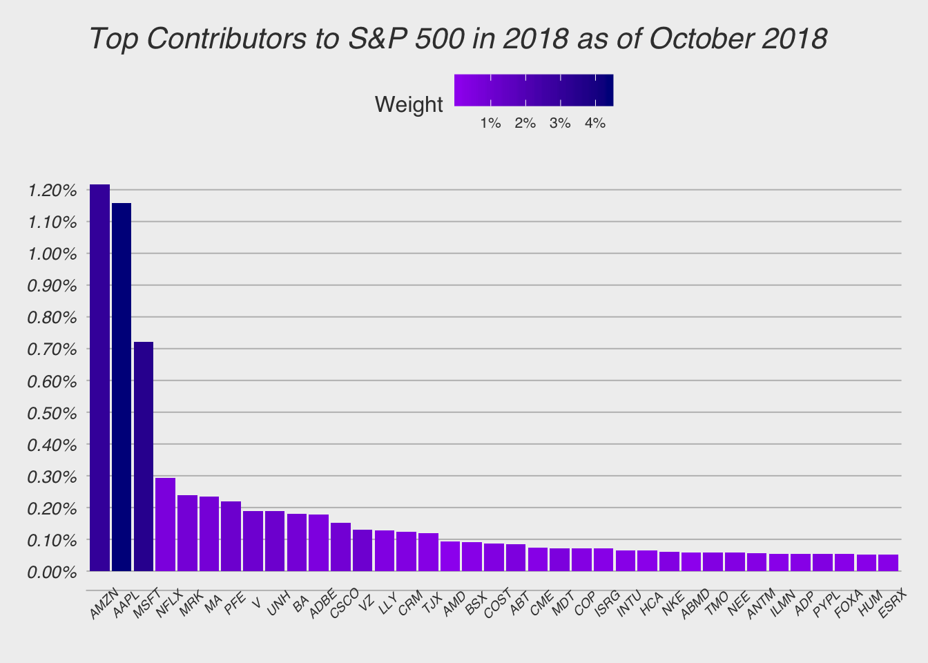 We can see from the chart Amazon, Microsoft and Apple have above 3% weighting in the S&P 500. All three stocks are outperforming the market as a whole. We can see that Amazon and Netflix are both up nearly 60% this year. The other best performing stocks so far this year are Abiomed, Advanced Micro Devices, Netflix, Advanced Auto parts, and Netflix.