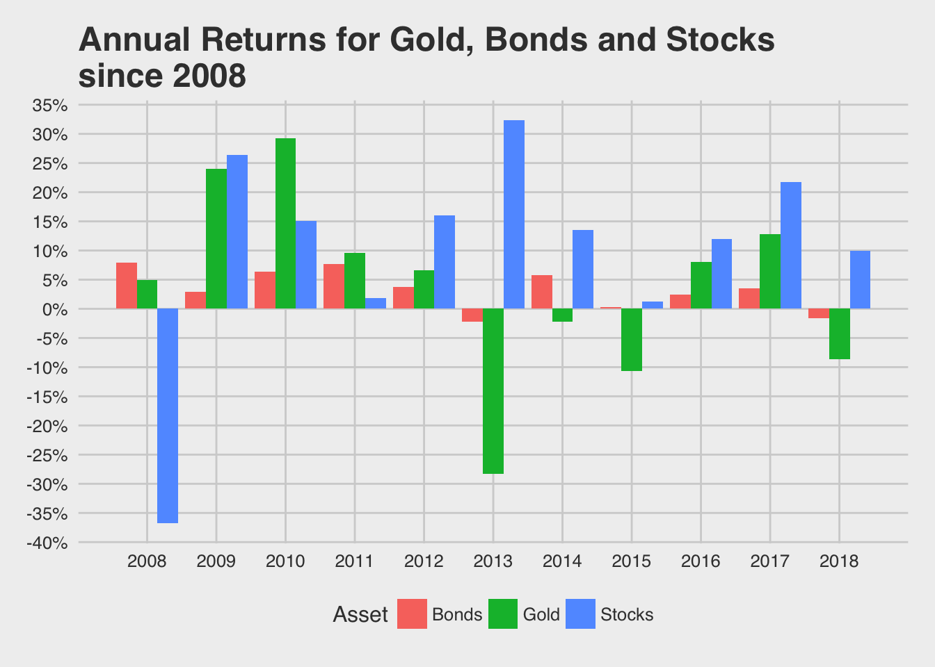 We can see that stocks had a terrible year in 2008. Stocks however have bounced back since then in a big way and they never had a negative returns since then. Gold on the other hand had a great run for the 4 years after the bankruptcy. But since 2012, it has had a terrible run with 4 years of negative returns (2013,2014,2015 and 2018). Bonds on the other hand were less volatile and gave steady returns with a couple of years of negative returns.