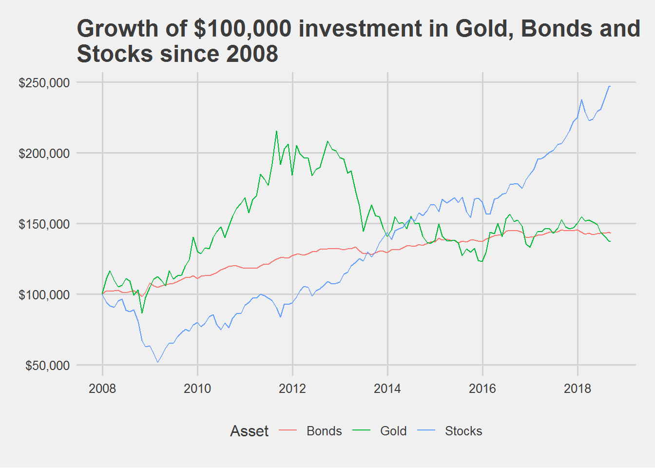 We can see that stocks had a terrible year in 2008. Stocks however have bounced back since then in a big way and they never had a negative returns since then. Gold on the other hand had a great run for the 4 years after the bankruptcy. But since 2012, it has had a terrible run with 4 years of negative returns (2013,2014,2015 and 2018). Bonds on the other hand were less volatile and gave steady returns with a couple of years of negative returns.