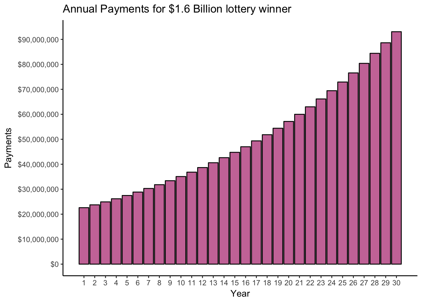 Well you may ask what are the yearly payments. The lottery’s website divides the payments in such a way that year each the value of payments goes up by 5% to keep up with inflation. So we dividend the $1.6 billion into 30 payments that increase by 5% each year and calculated the approximate value of each payment for each year.